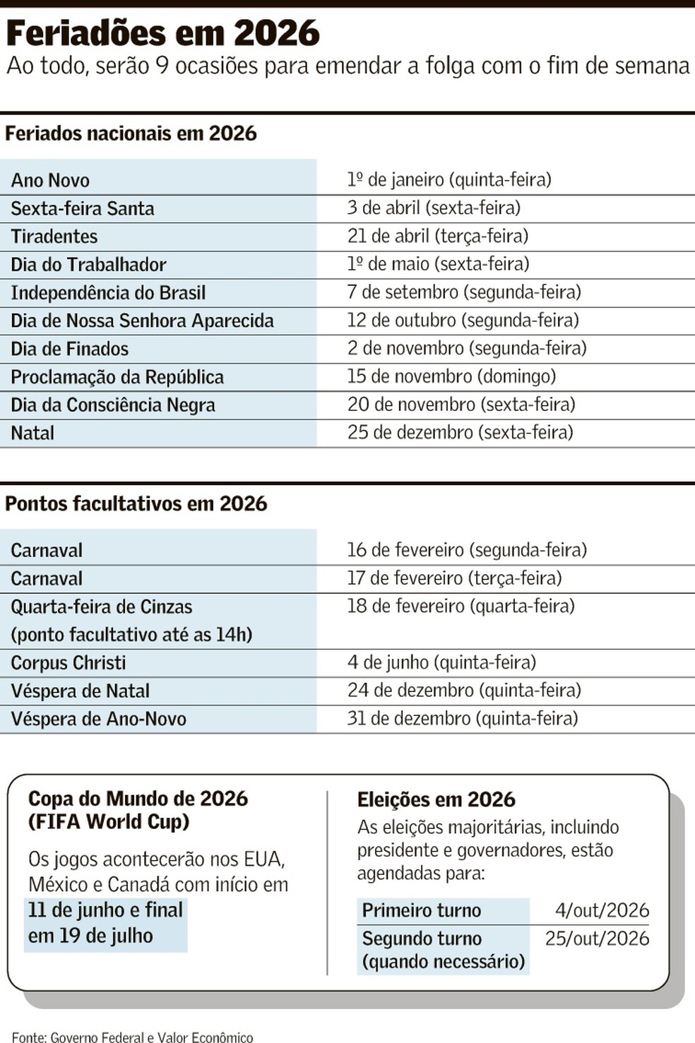 Além dos obrigatórios, o próximo ano também terá pontos facultativos com possibilidade de emendar folgas, como Carnaval, Corpus Christi e as vésperas de Natal e Ano Novo. Tudo isso se soma às eleições para presidente e governadores e à Copa do Mundo, que devem afetar operação, decisões estratégicas, geração de negócios e o planejamento das empresas, alertam especialistas.