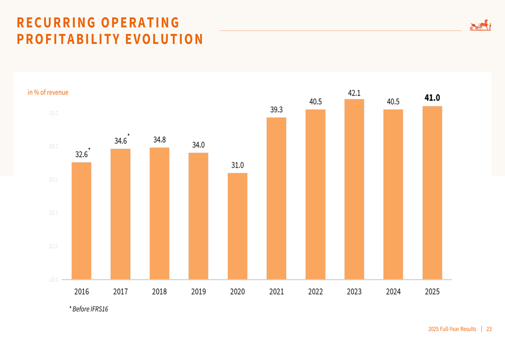 A Hermès entregou um resultado operacional recorrente de €6,57 bilhões em 2025, representando uma margem de 41,0%, ligeiramente acima dos 40,5% em 2024. O lucro líquido atribuível aos proprietários atingiu €4,52 bilhões, com margem de 28,3%. No entanto, excluindo uma contribuição excepcional, o lucro líquido teria sido de €4,86 bilhões com margem de 30,3%, em linha com os níveis de 2024.