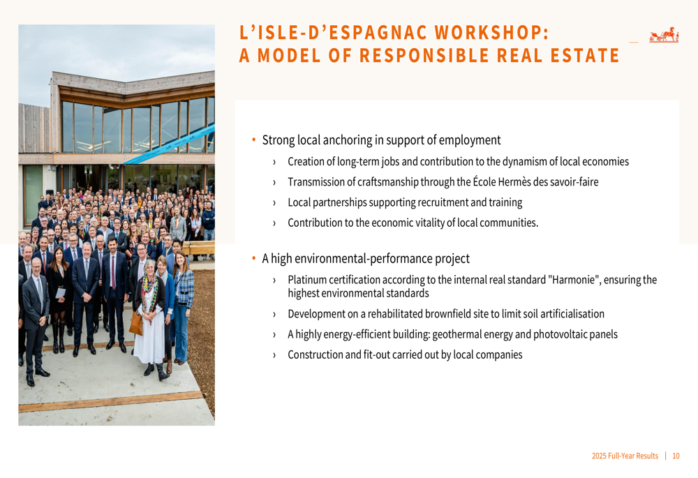 A Hermès continuou a investir em sua capacidade de produção, inaugurando sua 24ª oficina de artigos de couro em L’Isle-d’Espagnac (Charente) em setembro de 2025. A empresa tem quatro projetos adicionais de oficinas de artigos de couro em andamento, programados para abrir entre 2026 e 2030, reforçando seu compromisso com a fabricação local na França.