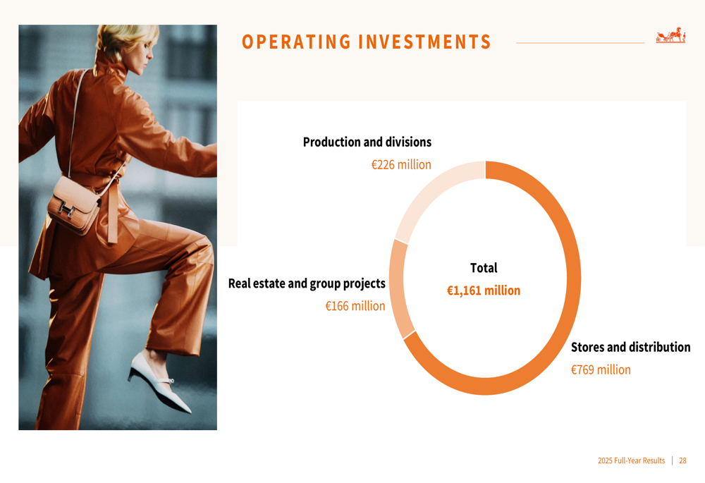 A Hermès manteve um balanço robusto com uma posição de caixa líquida de €12,77 bilhões no final de 2025, acima dos €12,04 bilhões em 2024. A empresa anunciou um dividendo de €18,00 por ação para 2025, representando um aumento de 12,5% em relação aos €16,00 pagos em 2024: