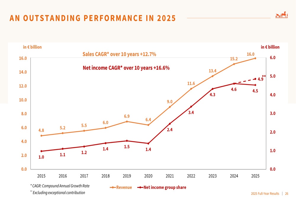 Na última década, a Hermès alcançou uma taxa composta de crescimento anual (CAGR) de 12,7% para receita e 16,6% para lucro líquido, demonstrando criação consistente de valor para os acionistas.