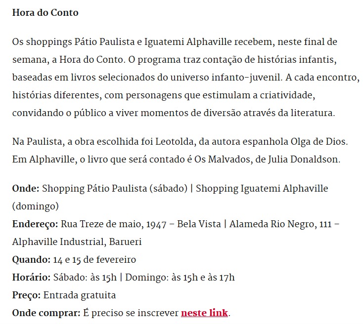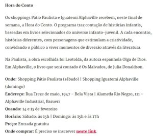 Os shoppings Pátio Paulista e Iguatemi Alphaville recebem, neste final de semana, a Hora do Conto. O programa traz contação de histórias infantis, baseadas em livros selecionados do universo infanto-juvenil. A cada encontro, histórias diferentes, com personagens que estimulam a criatividade, convidando o público a viver momentos de diversão através da literatura.