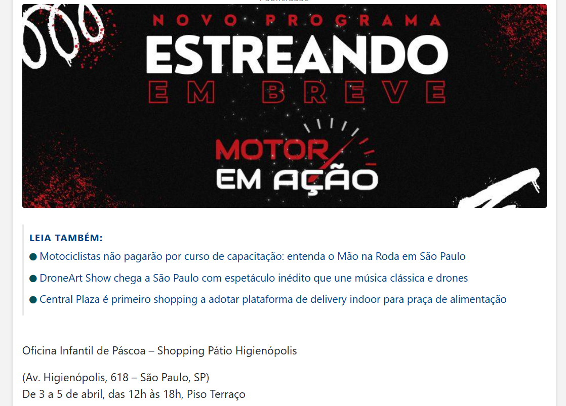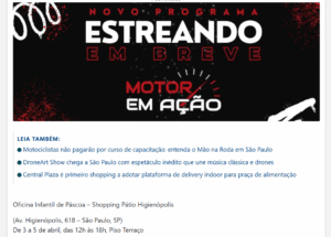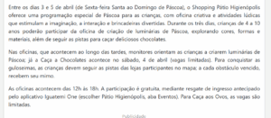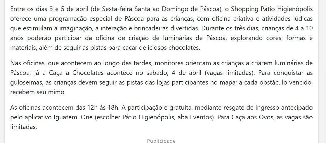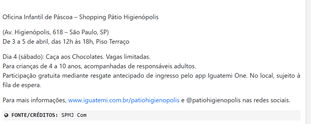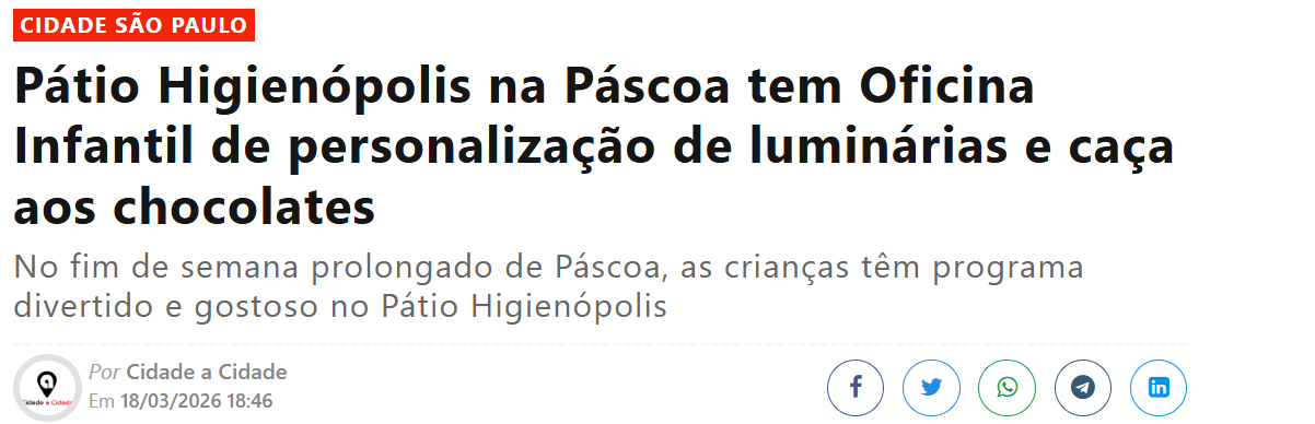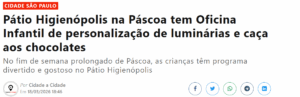 Veículo: cidadeacidade Clique aqui para ler a notícia na fonte Região: Estado: Alcance: Data: 27/03/2026 Editoria: Shopping Pátio Higienópolis Assuntos: Patio higienopolis na pascoa tem oficina infantil de personalizacao de luminarias e caca aos chocolates